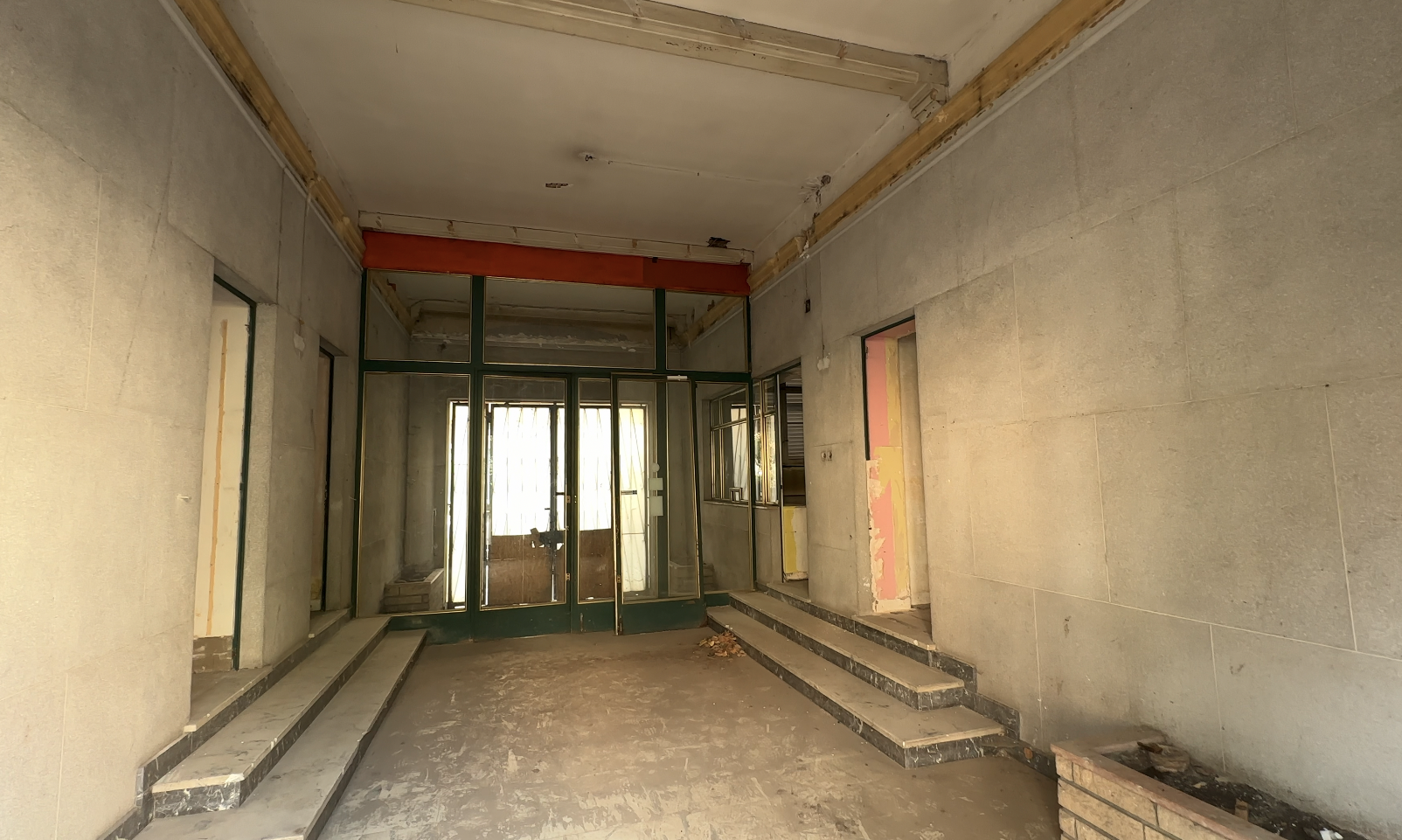 Destruction de l'ancien bâtiment de l'hôpital Sainte Blandine, construit dans les années 70, laissant apparaître le bâtiment historique à l'arrière, en août 2025. Vue de l'ancien hall d'accueil des visiteurs. Au fond la sortie vers la rue de la Gendarmerie.