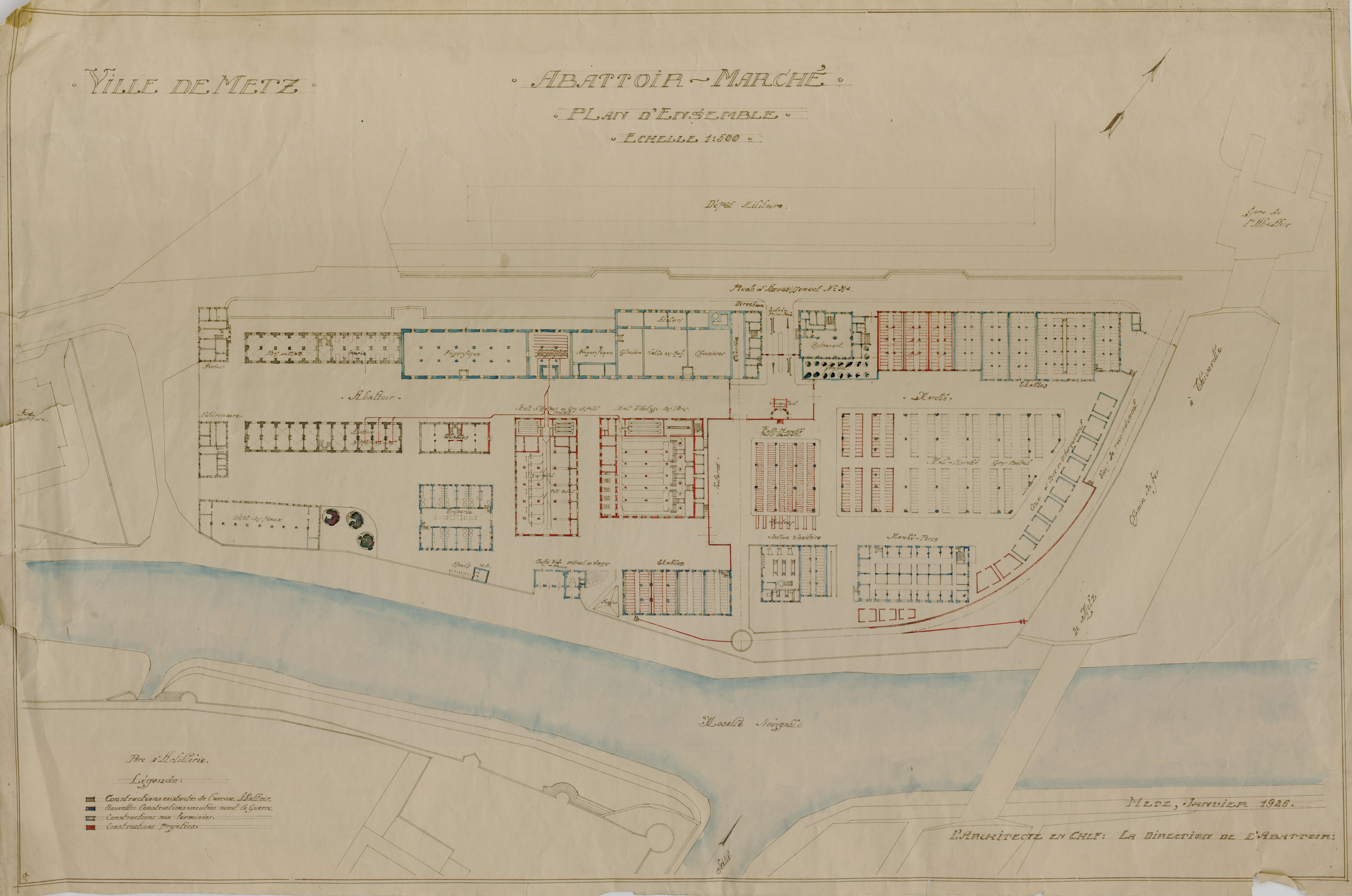 Plan daté de janvier 1926 qui représente le plan au sol des abattoirs de Metz par l'architecte de la direction des abattoirs.