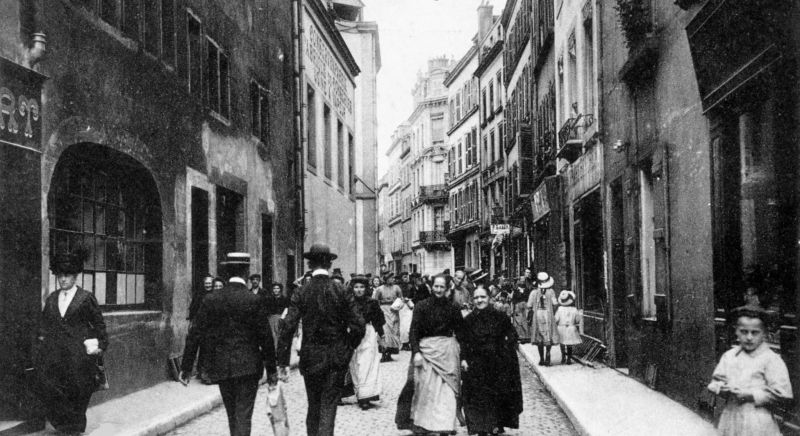 Vue en Chaplerue, vers la rue Serpenoise en 1900 avec la Conserverie Moitrier à la place de l'ancienne abbaye, à gauche.