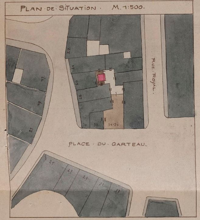 Plan du secteur autour de la place du Quarteau en 1919, issu d'un document d'architecte des Archives municipales de Metz sous la référence 2PC10931.