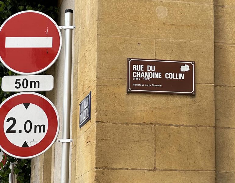 Panneau de la rue du Chanoine Collin à Metz pris en mai 2024 sur le mur de l'Hôtel de Ville à l'angle avec la rue Four du Cloître.