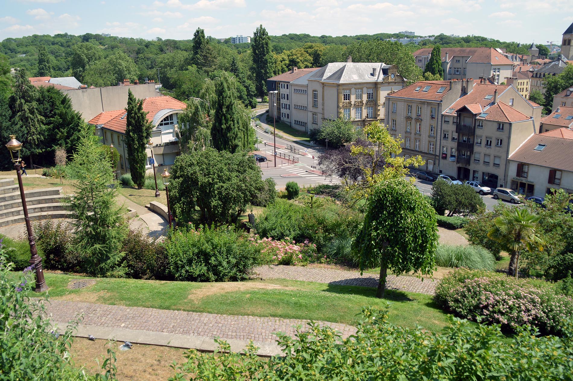 Le jardin des Tanneurs, pris en photo en juin 2023 depuis la rue des Murs. En fond, on peut voir l'école primaire Saint-Eucaire et la rue des Tanneurs, ainsi que l'église Saint-Eucaire coupée à droite. |