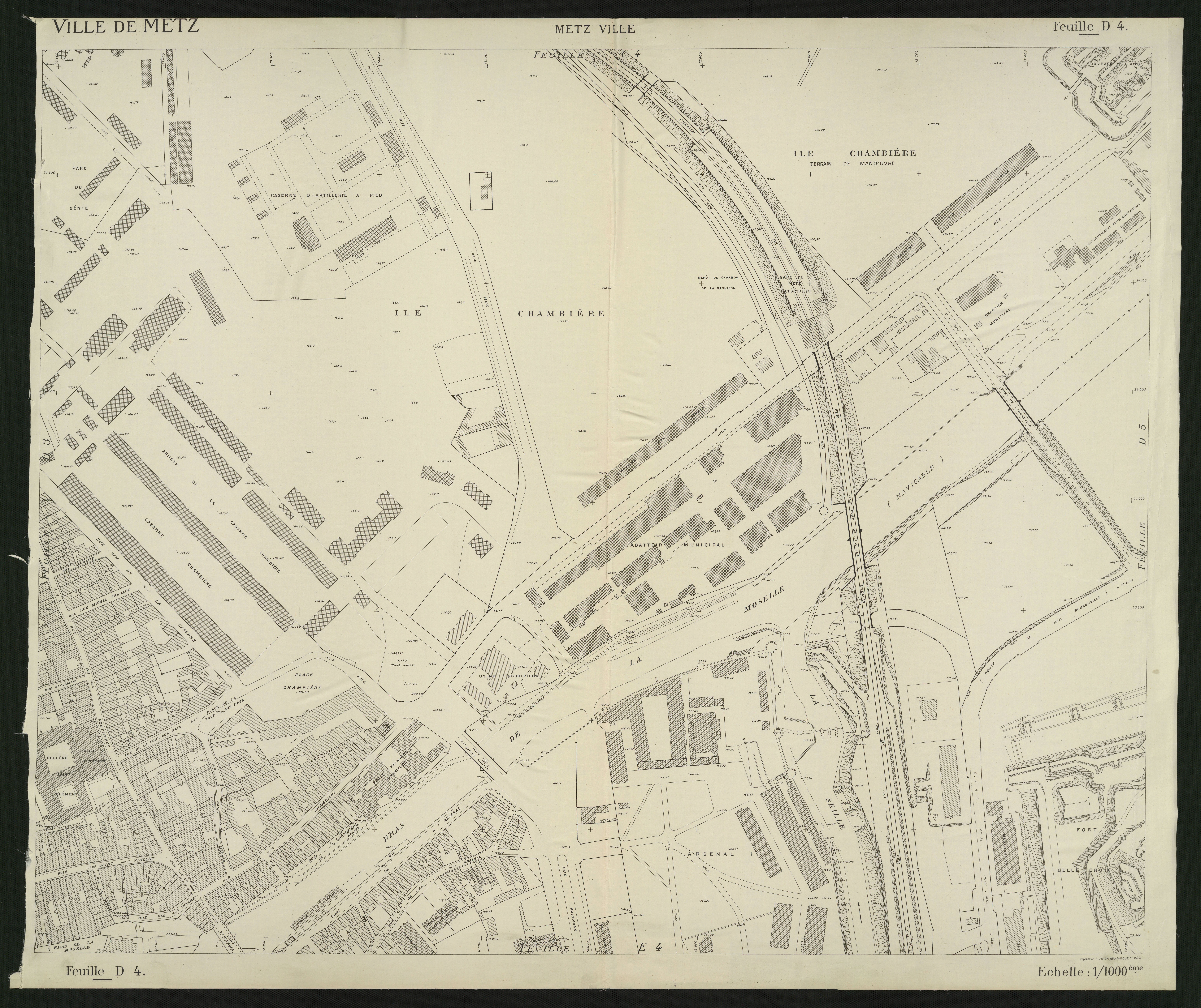 Plan cadastral de la ville de Metz montrant les quartiers du Pontiffroy et de l'île Chambière avec la gare de Metz-Chambière et l'abattoir municipal, dans les années 1930. Source : archives municipales de Metz / 9Fi3486.