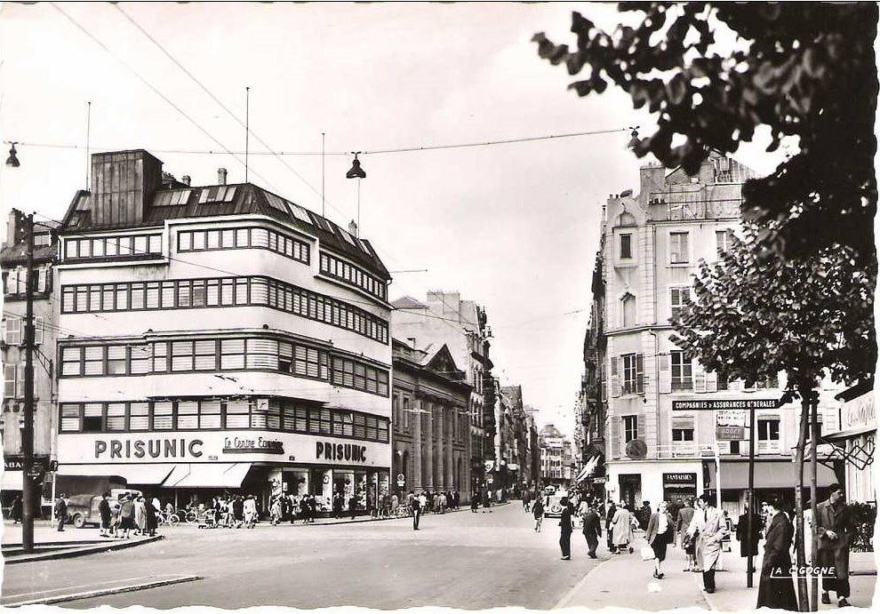 Carte postale de 1954 montrant l'entrée de la rue Serpenoise avec le magasin Prisunic et les compagnies d'assurances générales.