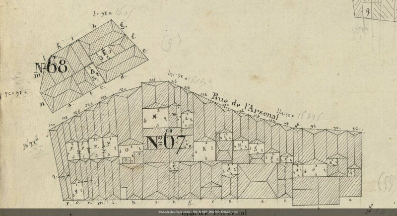 Extrait du plan du quai de l'Arsenal et de la rue de l'Arsenal en 1821-1822 avant sa démolition. Source : Musée des plans-reliefs