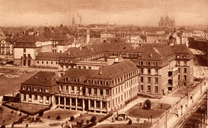 Hôpital Bon-Secours, rue de Verdun (en bas à droite) à Metz. Cliché prétendument du début du XXe siècle. Source : site du CHR Metz-Thionville.