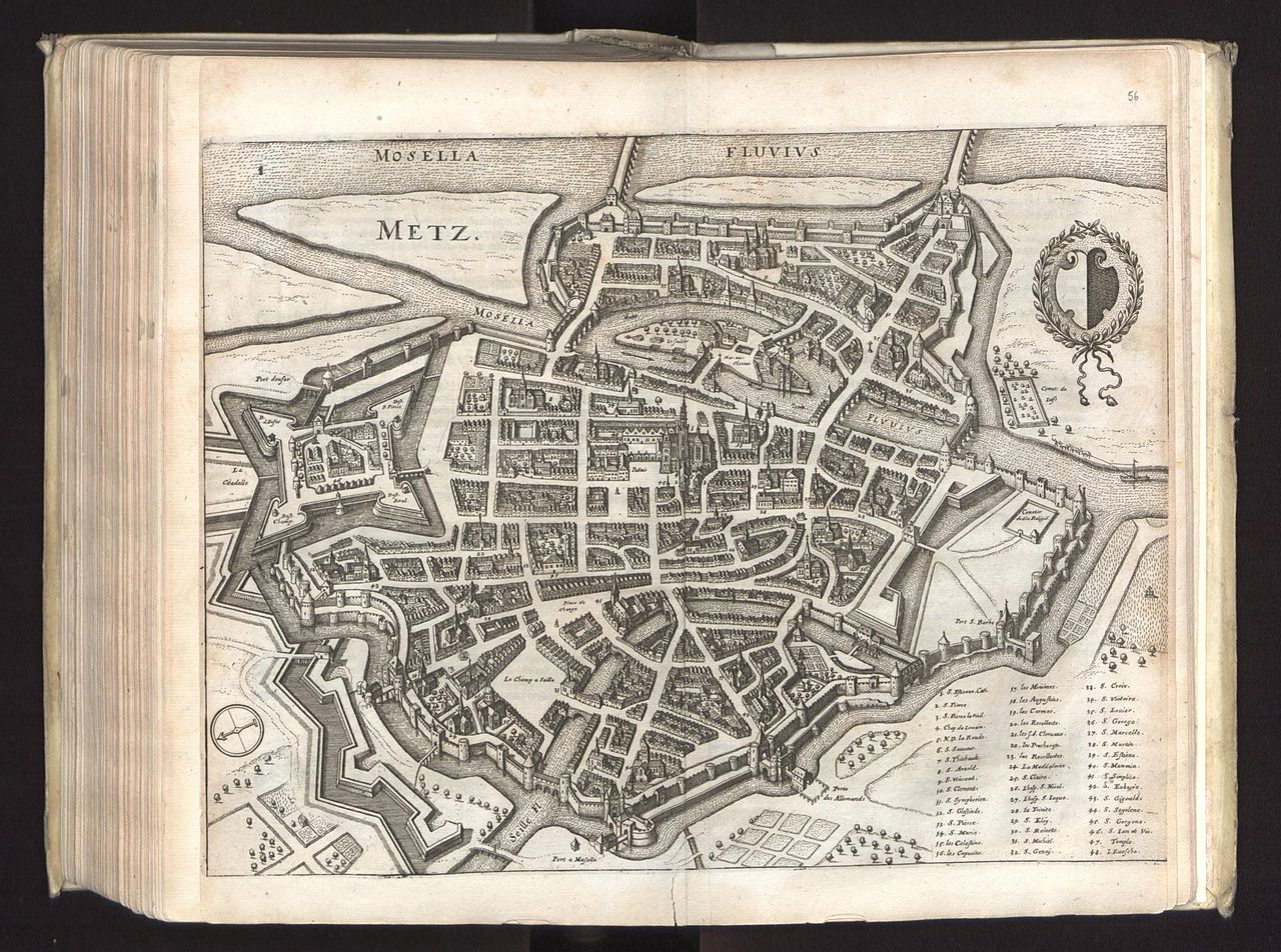 La ville de Metz en 1645, issu de Topographia Palatinatus Rheni et Vicinarum Regionum Das ist, Beschreibung vnd Eigentliche Abbildung der Vornemsten Statte, Plätz der Vntern Pfaltz am Rhein Vnd Benachbarten Landschafften, als der Bistümer Wormbs Vnd Speijer, der Bergstraß, des Wessterreichs, Hundsrücks, Zweijbrüggen, etc. (Düsseldorf : Universitäts- und Landesbibliothek, 2009).