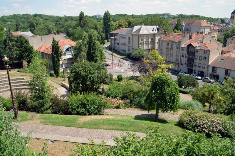 Le jardin des Tanneurs, pris en photo en juin 2023 depuis la rue des Murs. En fond, on peut voir l'école primaire Saint-Eucaire et la rue des Tanneurs, ainsi que l'église Saint-Eucaire coupée à droite.