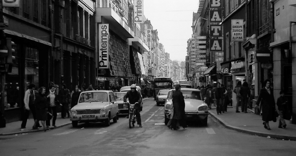 Photo prise à l'angle de la rue Serpenoise et la rue du Petit-Paris en direction de la place de la République au début des années 1980, photo par Alain Gloriod sur Facebook.