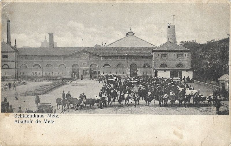 Les anciens abattoirs de Metz autour de 1900, potentiellement vue du nord vers le sud avec avec l'actuelle avenue Blida sur la droite.