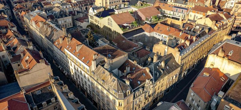 Vue aérienne du bloc de l'ancien « Printemps » à Metz en 2024 avec la projection de la construction d'appartement dans les anciens locaux. Images issue des architectes de Bouygues Immobilier, prêté pour WikiMetz. Vue depuis l'angle de la rue de la Tête d'Or (en bas à droite) et la rue Dupont des Loges en bas à gauche.
