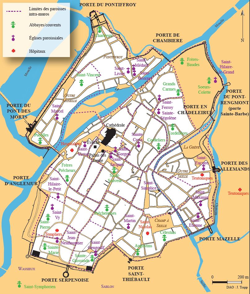 Cartographie de Metz au milieu du XVIe siècle par Julien Trapp, dans le document L’imprenable Metz publié en 2017. On y voit la limite des différentes paroisses de la ville, les abbayes et églises ainsi que les hôpitaux au sein des remparts et portes.