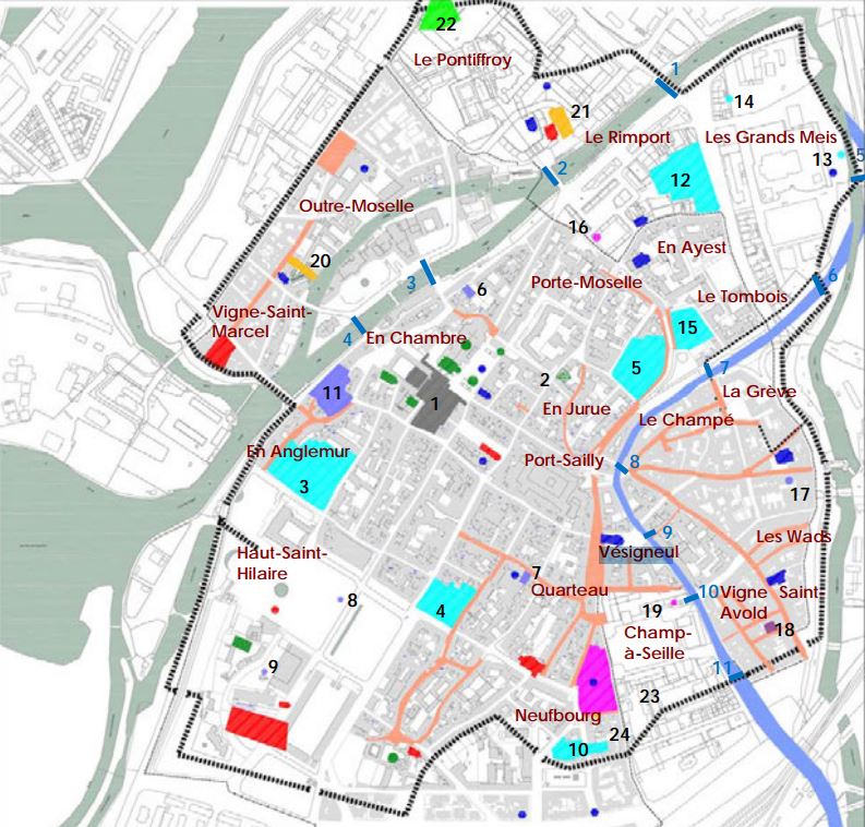 Cartographie de Metz de la fin du XIIe siècle au milieu du XVIe siècle publiée dans le document de la DRAC publié en 2017. Légende :