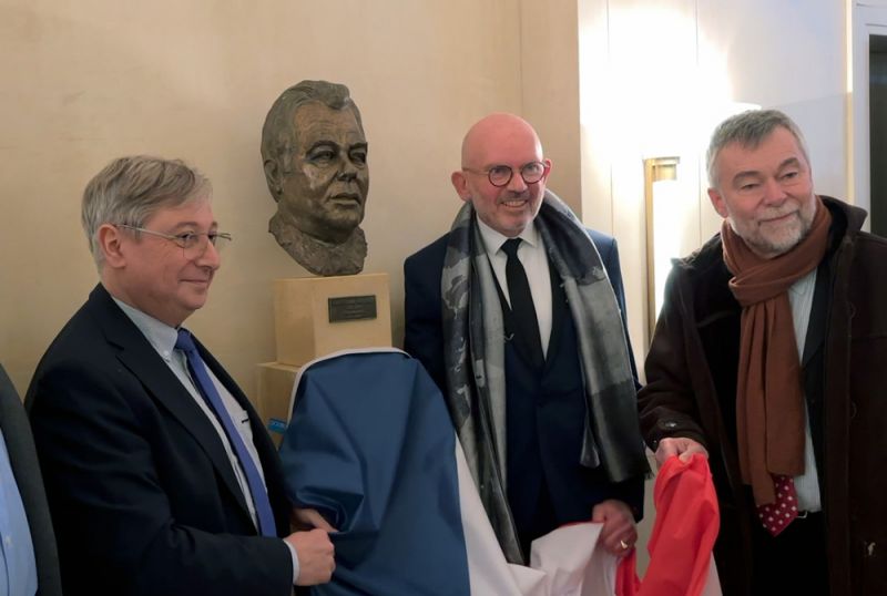 Inauguration du nouveau nom de l'Arsenal en Arsenal Jean-Marie Rausch le 23 février 2024 avec dévoilement du buste de l'ancien maire dans le hall. Sur l'image : François Grosdidier, maire de Metz, Patrick Thil, adjoint à la culture et Philippe Rausch, fils de Jean-Marie Rausch.