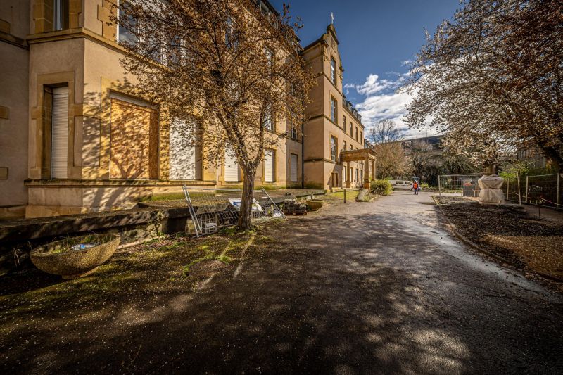 Prise de vue à l'intérieur de la cour de l'hôpital Sainte Blandine avant démolition en 2024. Photo prise par Batigère et fournies à WikiMetz dans le cadre de la visite de chantier. Vue depuis l'entrée de la rue du Cambout.