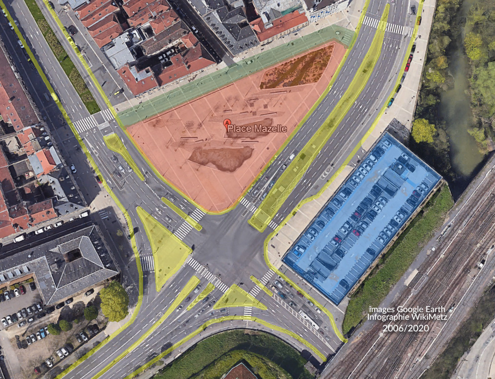 Les changements de la place Mazelle en 2010 et 2012 matérialisés sur une carte de la place en 2006 avec les emplacements des nouvelles voies de circulation (en jaune), du parking silo (en bleu), de la voie de rencontre piétonne (en vert) et de la nouvelle place piétonne (en rose) à date de 2019.